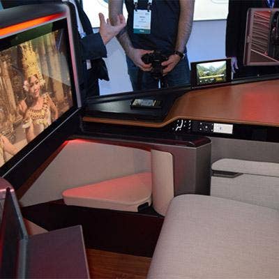 Panasonic's Avionics division showed off its next-generation business-class seat, which includes a spacious cockpit, 4-K TV, wireless charging, and a companion tablet that acts as a control panel for ordering food or selecting entertainment. The seat also includes noise-canceling headphones equipped with VioP for calls from seat to seat or beyond. Along with updating bells and whistles, Panasonic gave the onboard entertainment system a serious upgrade with what it calls the X Series inflight entertainment.