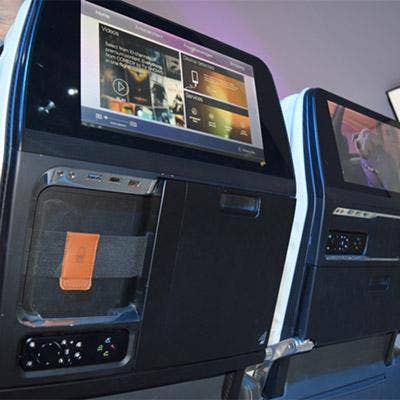 Along with rolling Waterfront for business-class, Panasonic also took a crack at jazzing up coach seats with some nice high-tech touches. These Jazz Seat backs, as Panasonic calls them, are packed with gadget-friendly features such as multiple input and output ports for HDMI and USB along with an inductive charging pad for wireless charging. The Jazz seat back also includes a touch 13-inch display with the updated X Series inflight entertainment system.