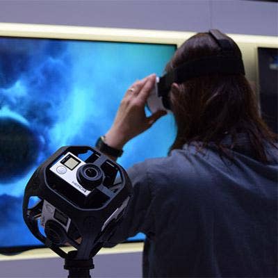 GoPro was showing off a 360-degree camera for consumers that allows you to create content to be viewed later on a touch-screen device. There, you can navigate either videos or images with your finger. Want to see what's going on in the video to the right? Just swipe the video image to the left and find out. GoPro said the spherical camera rig is also capable of shooting for Oculus and a host of other virtual reality platforms.