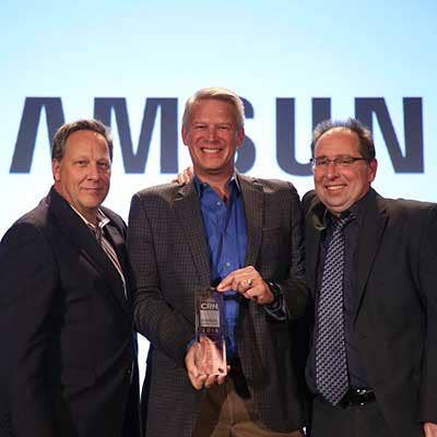 Seen here accepting the awards from Bob Faletra (left) and Steve Burke is Greg Taylor, Samsung VP of sales.