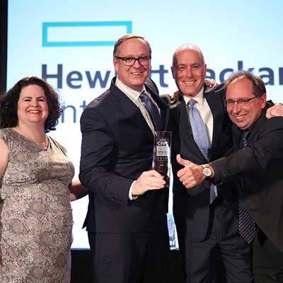 Seen here, Jennifer Follett and Steve Burke present the award to Terry Richardson (second from right), vice president and general manager, U.S. channel sales, and David Gaston, senior director of HPE servers.