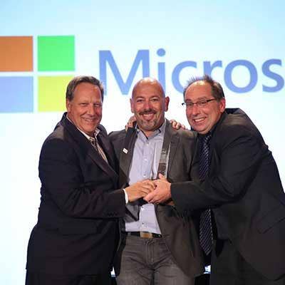 Eric Martorano, Microsoft's GM of U.S. partner sales, accepts the awards from Bob Faletra (left) and Steve Burke.