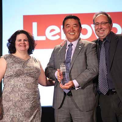 Chun Lee, Lenovo's director of VAR sales, is shown here accepting the award from Steve Burke and Jennifer Follett.