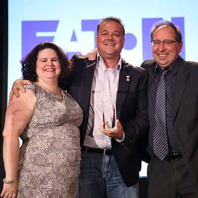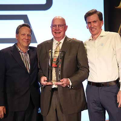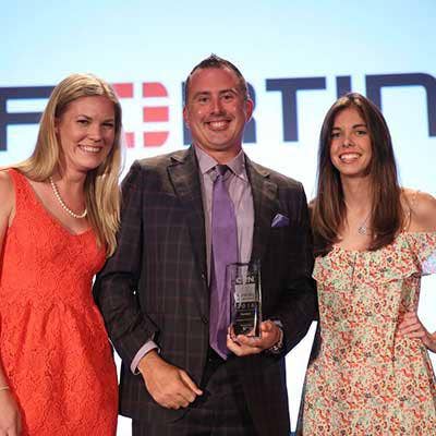 Bill Cunningham, executive VP of North America Sales & Marketing, hit the stage to accept his company's award from Steve Burke and Jennifer Follett.