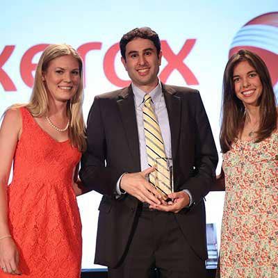 Justin Visconti, Xerox's director of channel marketing, celebrates the win with Sarah Kuranda and Meghan Ottolini.