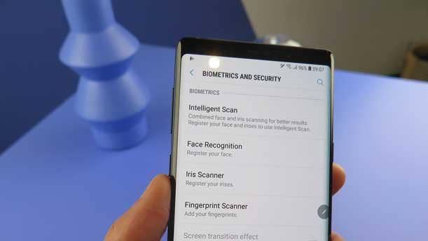 Samsung said that the Galaxy Note9 will feature the latest version of Samsung's mobile security software, Knox 3.2, which offers data protection as well as simplified deployment and management for IT departments. In terms of authentication, the Note9 will be available with fingerprint, iris and facial recognition, as well as Intelligent Scan (a combination of iris and facial recognition that purports to offer faster authentication). The fingerprint reader on the Note9 is located on the back of the phone below the camera, as on the Galaxy S9.