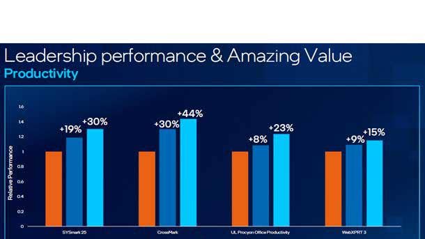Intel said its new mid-range Core i5-12600 is faster than AMD’s Ryzen 7 5700G across several benchmarks: 19 percent faster in SYSmark25, 30 percent faster in CrossMark, 8 percent faster in UL Procyon Productivity and 31 percent faster in Pugetbench Premier Pro, among others.
