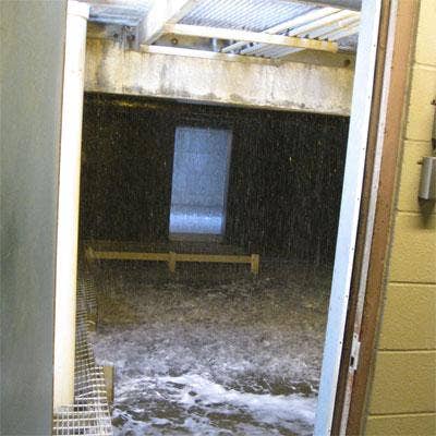 Inside the cooling towers it's always raining. The falling water is collected below and from there it is pulled out by pumps where it is cooled to 62 degrees. It ultimately reaches 42 degrees where it passes through the chiller. Here, water filters into a reservoir below to be pumped and cooled.