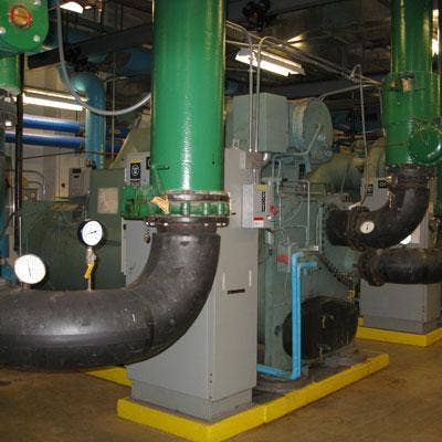 Four massive chillers (shown) in the data center's mechanical plant ensure the places stays cool. They cool water passed through an elaborate system to produce the cool air for the data center.