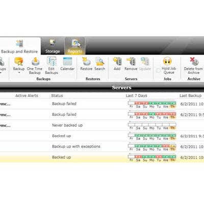 The Backup and Restore view lists all servers (as well as SharePoint farms and other distributed applications), giving administrators an at-a-glance color-coded view of the backup status for one week of all systems being serviced. Yellow indicates nonfatal warnings; failures are in red. Drilling into any of these indicators brings up the backup log and additional information about that particular day's backup job. Drilling into a specific server shows details about specific jobs, full and incremental backup history, alerts and other details.