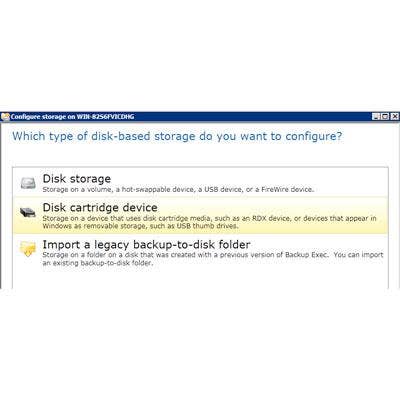 Once the storage type is selected, a list of available media of that type is shown from a list that's updated dynamically. When we initially launched Backup Exec 2012 for our tests, there were just disk storage and import options available. The disk cartridge option (shown highlighted) appeared after we added a Tandberg QuikStor RDX backup drive to the host system.