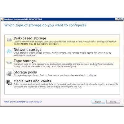 Part of the simplified nature of Backup Exec 2012 is its creation of storage. If a backup is attempted before any storage has been created, the application prompts as such and presents the corresponding link. The first step is to select the general storage type from this list of disk-, network-, cloud- and tape-based media, as well as from existing storage pools and media sets or vaults.