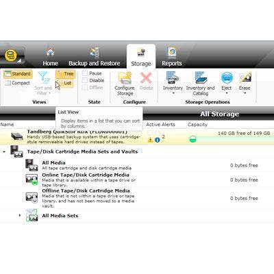 What used to be views for media, media server and devices has been replaced in Backup Exec 2012 by the Storage tab, a single place to monitor and manage ongoing backups and to create new ones. Commands available in the Storage tab are shown in the ribbon along the top edge and include views, state and configure (shown next). All global commands shown in ribbons also are available in Backup Exec 2012 menus.