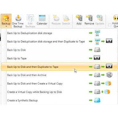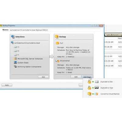 Replacing the Job Setup and Job Monitor views is the Backup and Restore tab. Its features include a simple point-and-click interface for creating new backup jobs from this list of common scenarios, including those involving a deduplication server. The highlighted scenario shown creates a process that first backs up to disk and then copies the backup to tape. What's really nice is the interface for editing these scenarios, shown next.