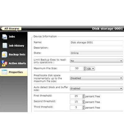 Once a storage device is created, its information can be easily accessed and edited by drilling into its icon in the storage devices view. In addition to modifying device name, state and write characteristics, administrators also can edit its logical path and thresholds that correspond to warnings about its capacity. This screen also presents a simple interface for viewing the storage medium's current and past jobs, backup sets and active alerts.