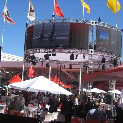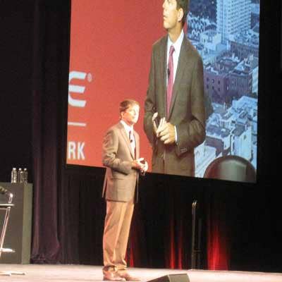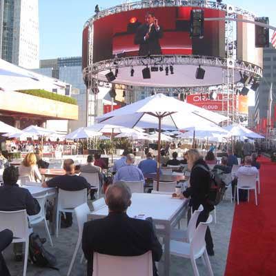 And, as shown here, Howard Street between Moscone North and Moscone South was carpeted over so that, if someone didn't know it was a road, he or she might think it was a regular plaza where attendees could eat lunch, meet and watch keynotes, such as this Monday morning one by Oracle President Mark Hurd, which was for a large part a repeat of his Sunday afternoon keynote to channel partners.