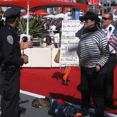 Her placard read, "In the midst of today's race fun, remember that San Francisco will lose multimillions as hosts! Shame on Larry Ellison."