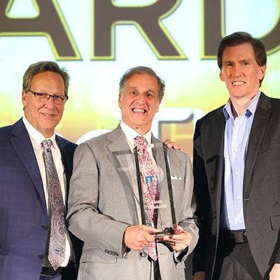 Accepting the award from Faletra and Burke is Curtiz Gangi, vice president of channel sales for Eaton's data center segment. Gangi dedicated the award to Brad Amano, an Eaton national account manager and regular XChange attendee who passed away in July.