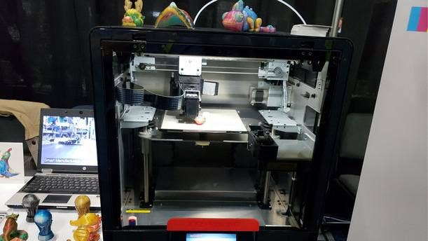 XYZ Printing showed off its new full-color 3-D printer at CES Unveiled 2019, the Da Vinci Color Mini, which aims to print high-quality color objects for consumer users and prototype makers. The Da Vinci Color Mini combines newly developed 2-D inkjet color printing technology with 3-D printing technology, applying CMY ink to a color-absorbing PLA filament as a way to offer "millions of color combinations," XYZ printing said. The 3-D printer offers layer resolution of 100 to 400 microns and a maximum build area of 5.1 x 5.1 x 5.1 inches, and weighs 52.9 pounds for easier portability. The Da Vinci Color Mini is scheduled to be available in March for $1,599.