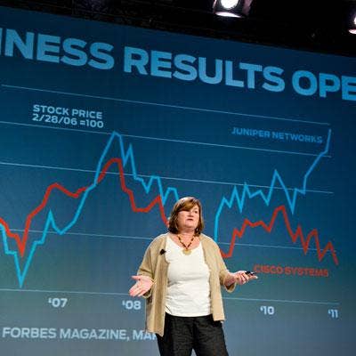 Stock performance isn't the only measure of a company's value over the long haul, but as Flaherty and others were quick to point out, Juniper's stock performance over the past five years has been a cheerier picture than that of its top networking rival, Cisco. Credit Flaherty and her lieutenants for knowing when to turn up the heat; as Juniper's conference got underway, Cisco announced a reorganization of its consumer unit -- one of several public relations headaches mighty Cisco has had to grapple with lately.