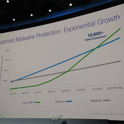 "This is game-changing innovation, and for anybody else selling anybody else's firewall out there, … you're going to be selling legacy technology to your customers," said Goeckeler, during his keynote after displaying numbers showing Cisco's lead over FireEye and Palo Alto Networks in AMP customers. "The best innovation and the fastest portfolios are happening right here at Cisco. … Cisco took over the No. 1 position as the security vendor in the industry."