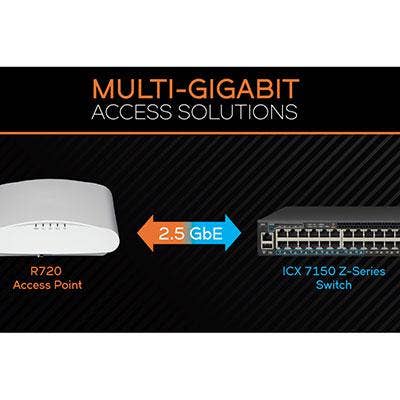 The ICX 7150 Z switch is a 48-port switch that includes 16 2.5-GbE ports and32 10/100/1000 ports. The 7150-Z includes dual hot-swappable power supplies and fans, while it is also stackable with other switches in the ICX 7150 family. The Ruckus R720 is a dual-band 802.11ac Wave 2 AP with one 10/100/1000 and one 2.5-GbE port.