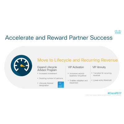 Cisco VIP Annuity is a new incentive program that provides partners with upfront rebates for landing a software-as-a-service (SaaS) deal, as well as expanding or renewing SaaS deals with existing customers. The program applies to enterprise networking, data center, security and collaboration sales with performance-based recurring revenue rebates. VIP Annuity is replacing Cisco's legacy VIP SaaS program.