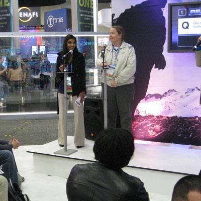 Security vendor M86 Security hosted a quiz show at its booth on the RSA show floor, quizzing attendees on their knowledge of IT security. Here, two contestants square off.