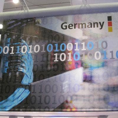 The German Federal Ministry of Economics and Technology, in cooperation with the Association of the German Trade Fair Industry, sent 15 German security vendors to tout the virtues of their products and services. To illustrate their tech savviness, the organizations added a bunch of ones and zeros to their show floor signage. Get it?