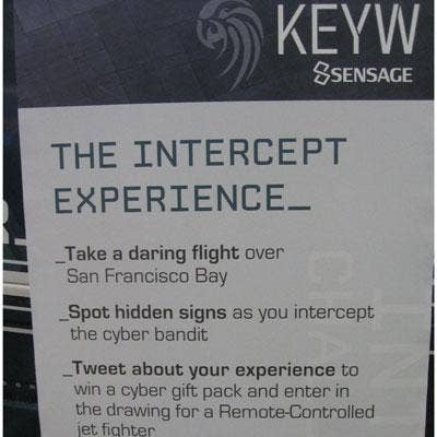 Sensage's Intercept Challenge wasn't all fun and games; players had to hunt down a "cyber bandit" during their daring flight over the San Francisco Bay Area. When they were done, and their motion sickness had subsided, attendees were invited to tweet about their experience.