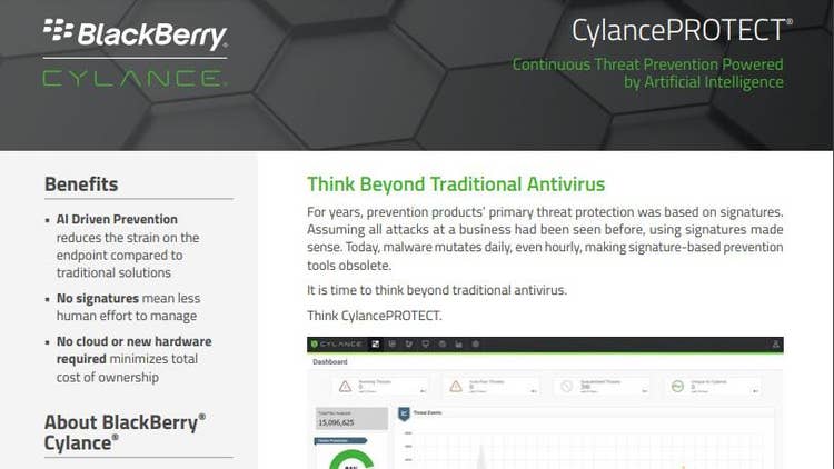 Building off Blackberry's acquisition of Cylance--and its advanced artificial intelligence-based security capabilities--the BlackBerry CylanceProtect for Mobile solution offers mobile threat defense to devices managed by BlackBerry's Unified Endpoint Management platform. CylanceProtect for Mobile provides next-gen mobile endpoint protection including prevention, detection and remediation of mobile threats.