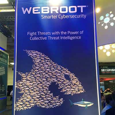 Security vendor Webroot touted its "collective threat intelligence" technology, which secures data from customer endpoints all over the world, as akin to a school of small fish teaming up to go after a big shark. It was an interesting visualization and one of the more striking examples of signage from the RSA conference.