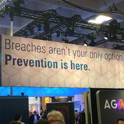 Not all signage at RSA hit the mark, however. Here, a vendor tells attendees they needn't give up and accept that attackers will break into their networks. Prevention is available, the vendor says here, without elaborating.