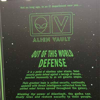 AlienVault, a security vendor that sells threat-monitoring and -management software to midmarket companies, made a big splash at RSA with its "Star Wars"-themed booth, which also featured a flying saucer hanging overhead. Tying movie analogies into IT security brings with it a high risk of sounding cheesy, but AlienVault's marketers, to their credit, pulled it off with skill and panache.