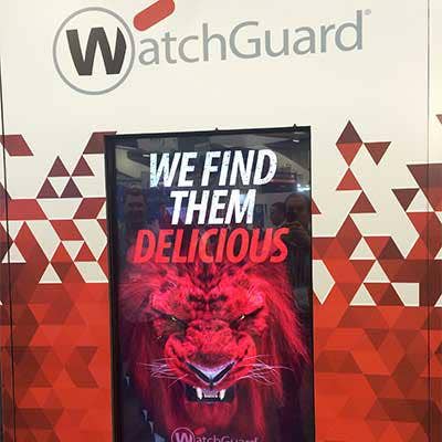 Security vendor WatchGuard wants you to know it's not afraid of hackers. Its threat protection is like a lion that's waiting to devour anyone and anything in its path, as can be seen in this cool digital signage. This was easily one of the more impressive bits of signage from the RSA conference.