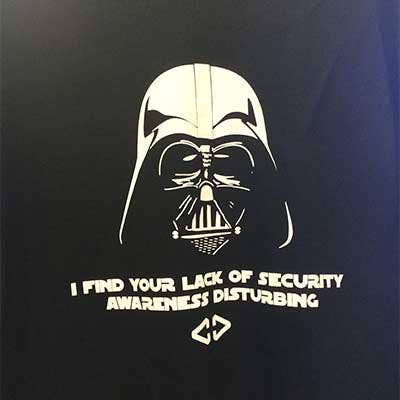 AlienVault, like we said earlier, really embraced the "Star Wars" theme, giving away T-shirts at its booth with Darth Vader scolding people for not paying enough attention to securing valuable assets.