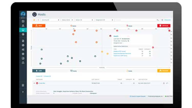 Vectra’s local learning models look for indicators of important phases of an attack or attack techniques, such as that an attacker is exploring the network, evaluating hosts for attack, or using stolen credentials. The company’s model tracks events through the cyberattack kill chain, correlating them to specific hosts that show signs of threat behaviors and assimilating them into an up-to-the-moment risk score.