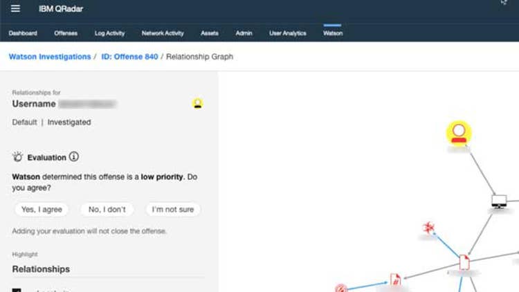 IBM Security’s QRadar Advisor applies cognitive reasoning to identify the likely threat and connect threat entities related to the original incident such as malicious files, suspicious IP addresses, and rogue entities to draw relationships among these entities. The tool automatically taps into Watson for Cyber Security to apply external unstructured data including threat intelligence feeds, websites, and forums.