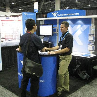 At the WWT booth, Ed Halopka, a data center technical architect based out of the Phoenix office, describes his company's services to a client.