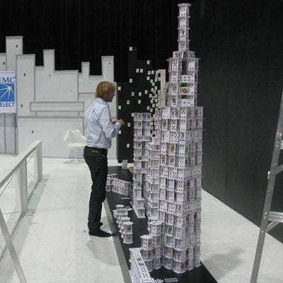 The EMC Select booth featured Bryan Berg, the Guinness World Record holder for assembling buildings out of playing cards without the aid of glue or tape. Berg's tallest building reached over 25 feet tall and required over 1,700 decks of cards.