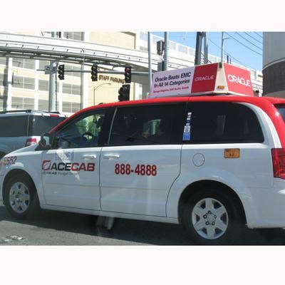 The sign on the top of this taxi claims that Oracle beats EMC in NAS performance. Another sign on the back of many taxis also brags about Oracle's virtualization technology compared to that of VMware, which is primarily owned by EMC.