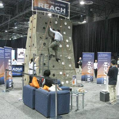 The booth of Greenbelt, Md.-based solution provider Presidio featured a four-sided rock climbing structure along with trained "anchor" people who encouraged clients and potential clients to "Reach Your Peak."