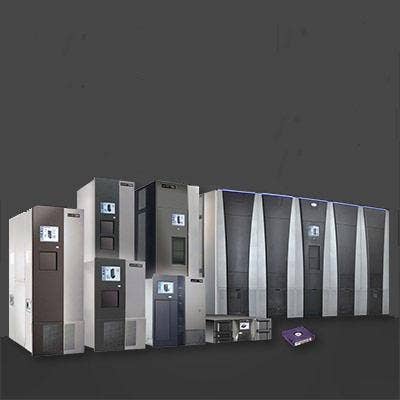 The flagship NEO 8000e, targeting enterprise-class data centers with very large backup and archive requirements, scales from 100 to 1,000 slots and one to 24 tape drives, and features redundant power, redundant robotics and logical partitioning.
