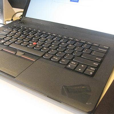 At the registration area, the bank of laptop PCs EMC provided for attendees to sign in were Lenovo ThinkPads, although one had to look carefully to tell. Someone at EMC apparently decided that covering up the ThinkPad logos on the PCs with black electrical tape would be a good idea.