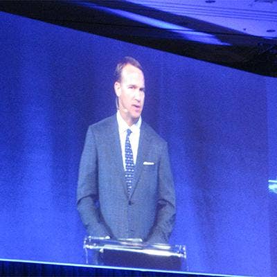 Peyton Manning, who retired after leading the Denver Broncos to a win in the Super Bowl this year, gave a speech at the EMC Global Partner Summit, held in conjunction with EMC World, in which he talked about his work as a spokesperson for Papa John's pizza restaurant chain and his experience as a quarterback over 18 seasons in professional football.