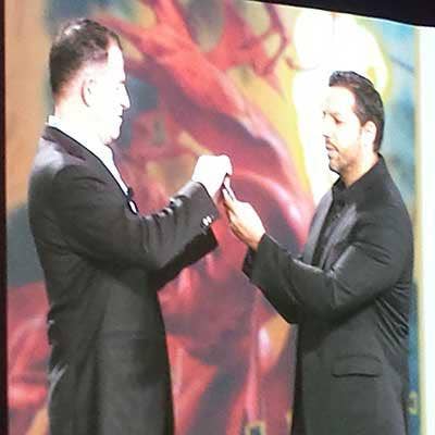 In keeping with a recent trend toward magicians at tech conferences, though, Dell welcomed David Blaine to the stage to blow some minds, and while he didn’t attempt any stunts in which he shoots or freezes himself, he did ask an audience member to drive an icepick into his hand, conjured a missing puzzle piece for Dell EMC infrastructure chief David Goulden, and here, impresses Dell with an unusual card trick.