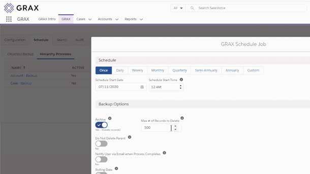 The Grax SaaS Data Archive was designed to keep archived data completely accessible in production. The software schedules autoarchiving jobs to manage storage costs and application performance, removes data from an application without removing access, and makes archived data available for reports and analytics, all within Salesforce Einstein environments.